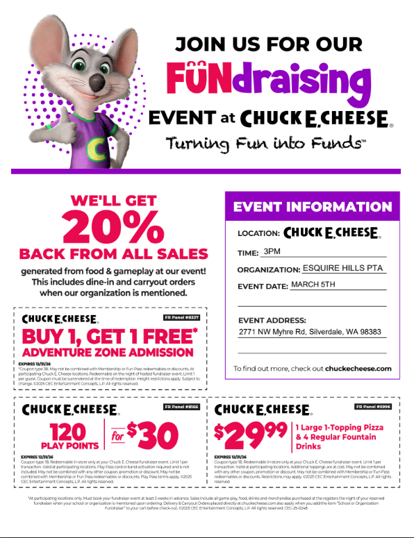 We are hosting a fundraiser TONIGHT March 5th starting at 3pm at Chuck E Cheese in Silverdale! Bring the family out for a night of fun. Esquire Hills PTA well receive 20% back from all sales. Coup...