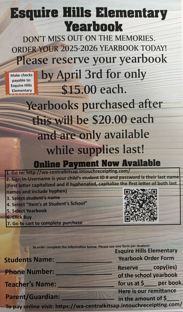 Yearbooks are on sale for $15 each until end of day April 3rd. After that yearbooks will be $20 starting April 4th and while only supplies last. You may pay in the office or online using the instru...